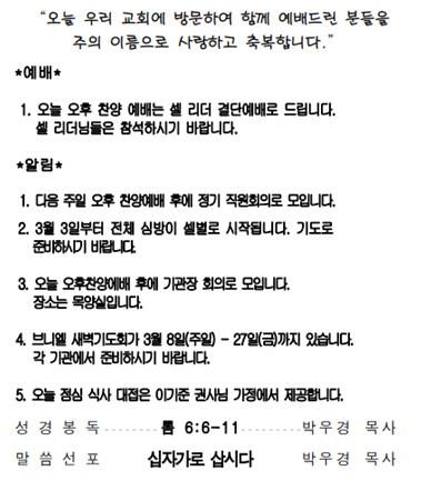 2026년 3월 1일 주일(광고, 주일 낮 설교)
